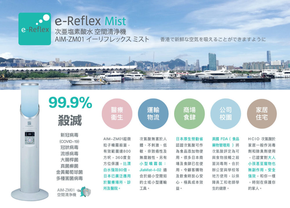 與一般以收集塵埃為目的之空氣淨化器不同,e-Reflex Mist不但能殺滅、抑制、分解浮游在空氣中,及黏附著室內任何物件表面上的細菌和病毒,包括Covid-19/SARS-CoV-2 (註1) (如:家居門把手、枱面、食品表面上,甚至頭髮上等),更可除臭,分解異味;因此,採用e-Reflex Mist是世界上現時唯一最有效(註2)的防疫措施!